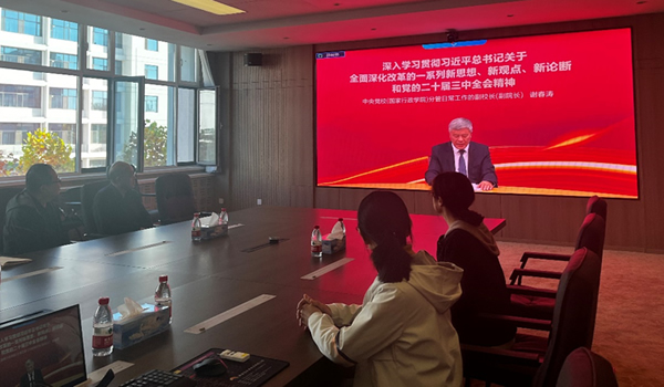2024年11月12日,继续教育学院教师党支部组织全体党员在会议室观看中央党校副校长谢春涛主讲的“深入学习贯彻习近平总书记关于全面深化改革的一系列新思想、新观点、新论断和党的二十届三中全会精神”视频讲座。