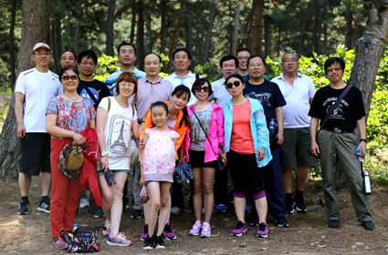 初夏时节已有热风扑面,但会员们似乎没有谁去在意。在导游的带领下一路练习校歌,一路欢乐前行,欢声笑语中飘荡着激动的心情一扫燥热带来的不适,向着大山向着蟠桃峪一路奔去。到达后会员们各显其能,有围绕着山包、树木进行小型徙步穿越、爬山的,有悠闲的和美景合影留念的;有的登高望远,欣赏祖国壮美山川,还有的捡拾野果。大家不忘环保,顺便带走其他游人的垃圾。大家玩得气喘吁吁、汗流浃背,略显疲惫但蟠桃峪的松涛林海,优美景色还是深深的感染了大家。在不经意间亲近了自然,融入了自然,放松了身心,陶冶了情操。上午大家享受了蟠桃峪的山色,下午又去体验蟠桃峪的水美。大家撑起一支绿竹篱,划开一片碧绿水,心情漂荡,悠闲自在。尽管只有面积不大的水面,可是大家还是开心的去游戏,以致让人有些流连忘返。