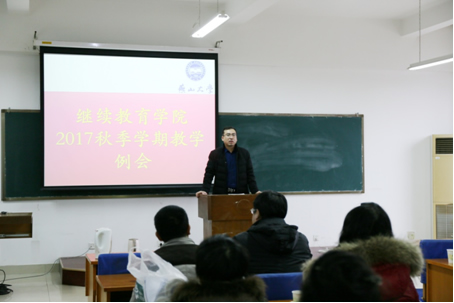 2018年1月4日,继续教育学院在学院办公楼A201室召开了2017年秋季学期期末教学例会。学院领导班子成员、专任教师及相关科室人员参加了会议,会议由学院院长孙利同志主持。