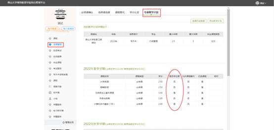 第二项,选课管理,点击专业教学计划,界面如下图,可以查看课程中是否为学位课。