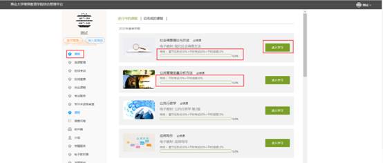 5、进入系统后界面如下图,学生需了解两项功能:课程、选课管理。第一项,左侧列表默认为课程,点击进入学习(红色框位置),进行在线课程学习(必修课)。